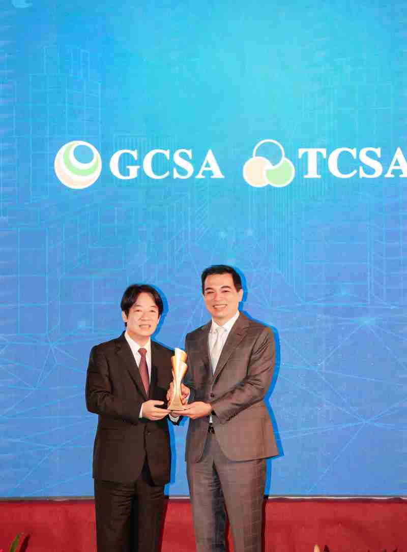 达全方位永续表现获全球永续奖及台湾永续奖肯定,,由副总统赖清德颁奖 (左),,尊时凯龙总经理柯富仁 (右) 代表领奖