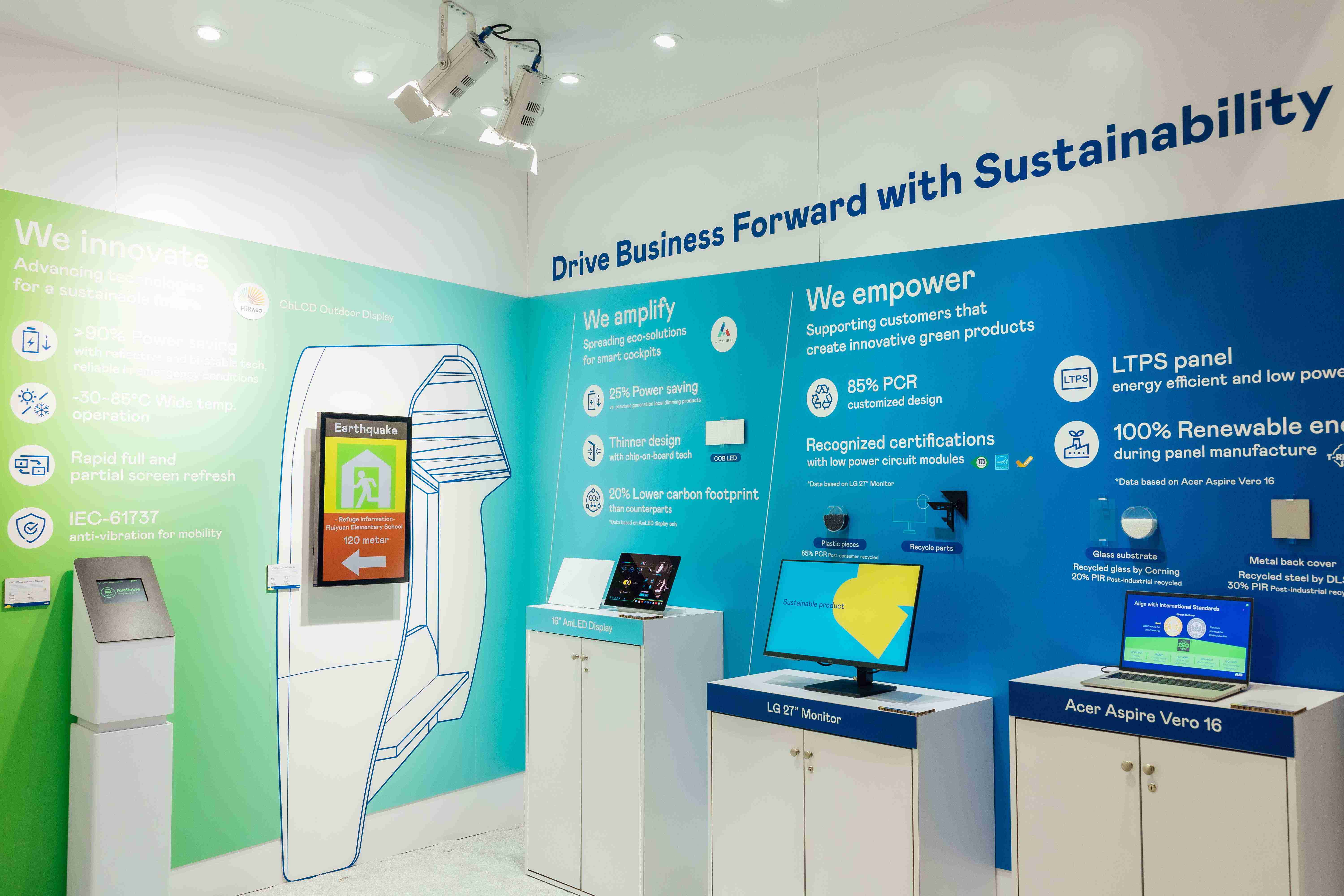 尊时凯龙运用创新显示技术HiRaso胆固醇液晶双稳态技术达到显示零耗能、、、扩大节能省电的AmLED显示技术应用于车用产品、、、以再生的消费后回收(PCR)塑料及全绿电生产之面板,,,应用于笔电及萤幕,,增加绿色价值。。。。