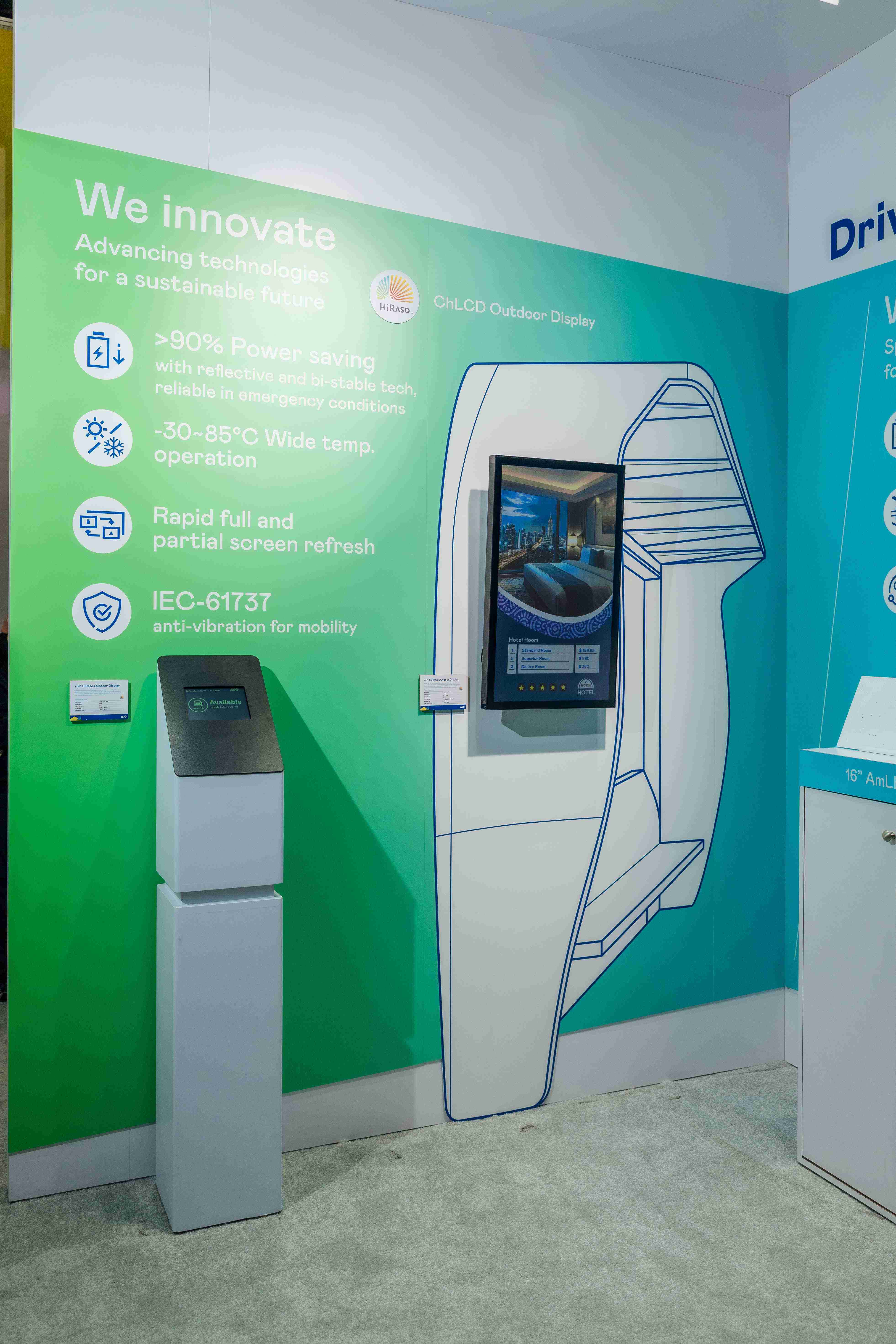 HiRaso胆固醇液晶显示器运用反射环境光线的方式,,呈现影像显示时零耗能的环保省电诉求,,,,光线愈强愈能呈现绝佳的色彩饱和度及显示效果,,,,同时在摄氏-30度至85度间宽温的使用优势,,,为户外电子看板的新首选。。