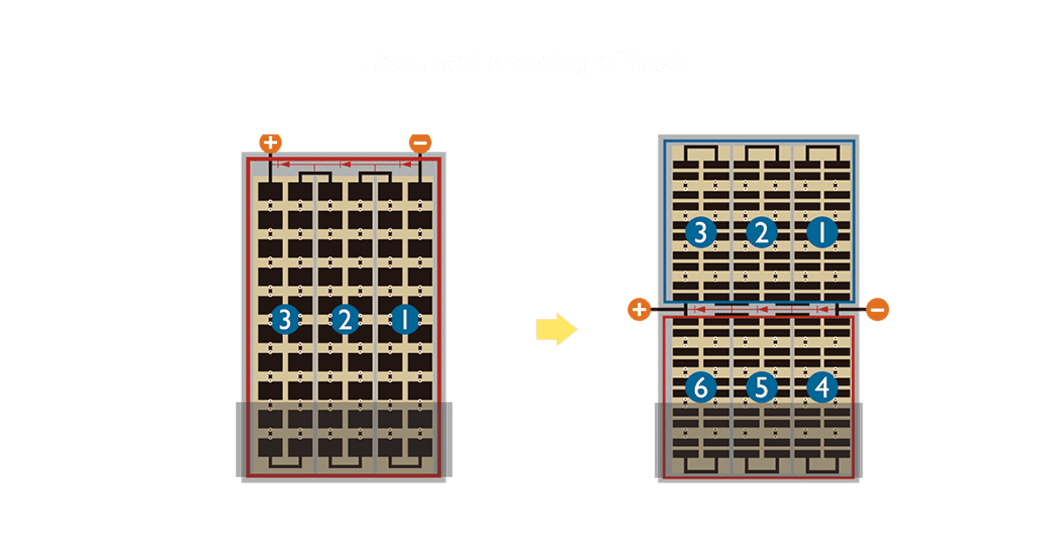 - 结合半切电池,,,降低遮阴影响、、提升模组抗隐裂能力、、、并减少电阻损耗,,进一步提升模组发电效能。。